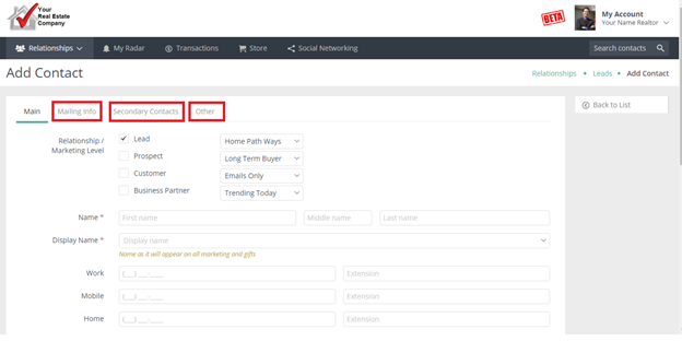 Once in the Add Contact screen, choose a Relationship type and Marketing Level. Next, enter in the contact information, being sure to fill in all of the fields with a red asterisk (*) next to them. Also, make sure that the Display Name is correct--this is where you will change 'Robert' to 'Rob' if your contact has a nickname they prefer. 'Display Name' is the name which will appear on all marketing pieces. Click “Add” or “Add & Return” at the bottom.