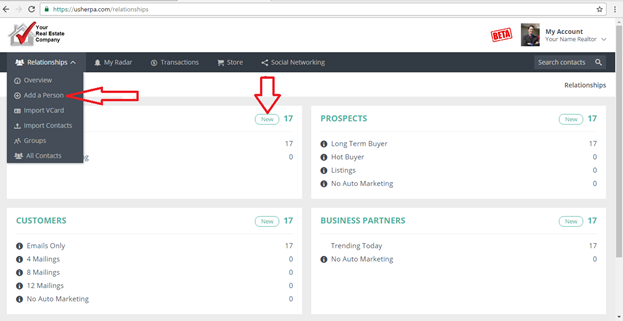 In the “My Account” section you can add a new person by simply clicking on the Relationships drop-down box and choosing “+Add a Person”. You can also do this from the “ADD” button.